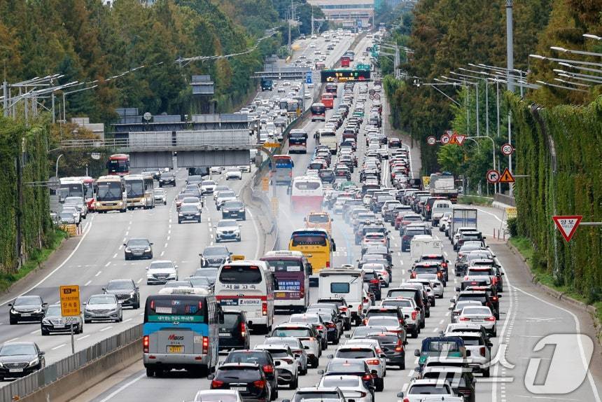 추석 연휴 둘째 날인 4일 서울 서초구 잠원 IC에서 바라본 경부고속도로 부산 방향(하행선)이 귀성 차량으로 정체를 빚고 있다. 2025.10.4/뉴스1