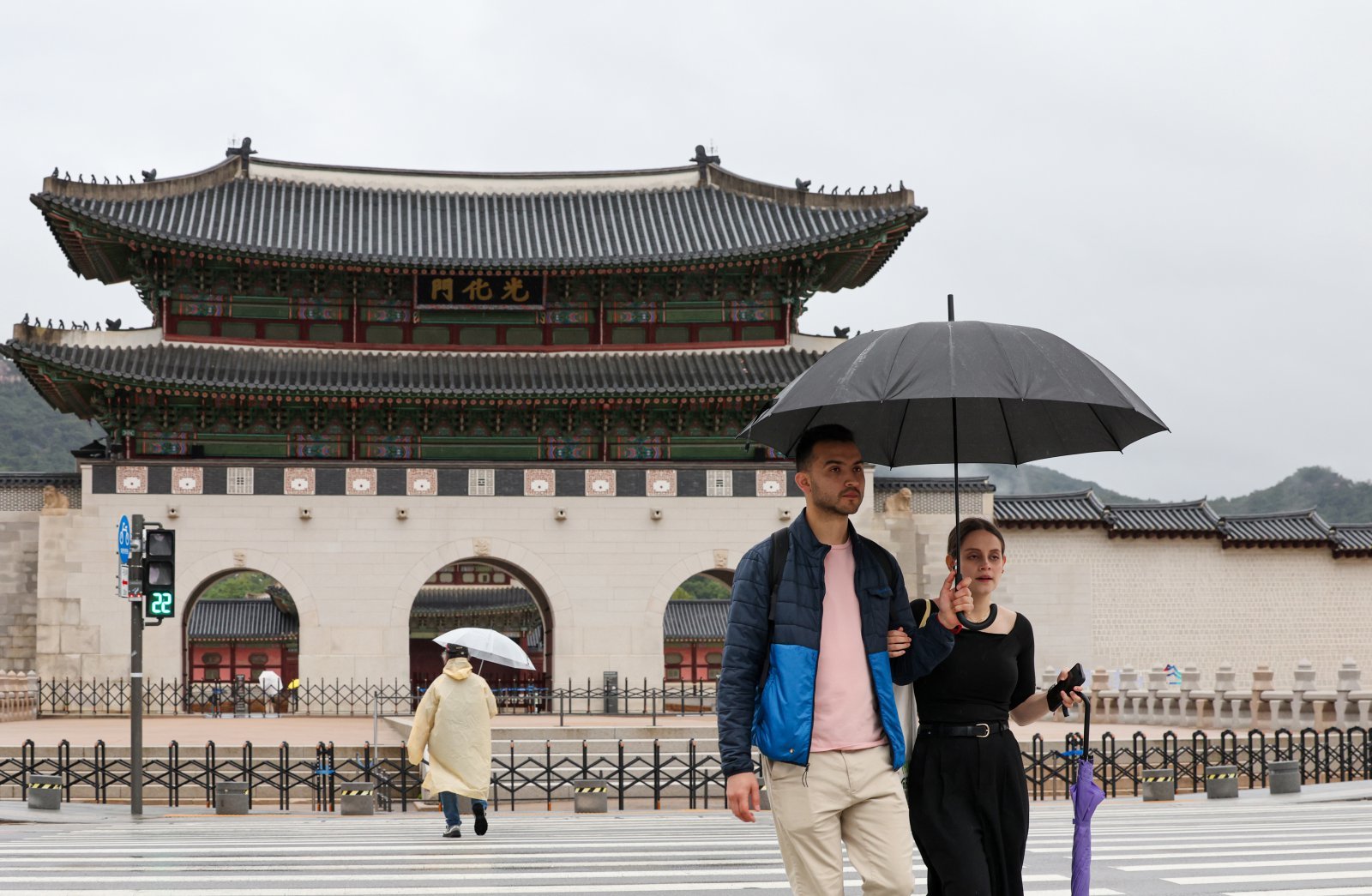 전국 대부분 지역에 비가 내리는 13일 서울 종로구 광화문 앞으로 우산 쓴 외국인 관광객들이 발걸음을 옮기고 있다. 2025.10.13/뉴스1