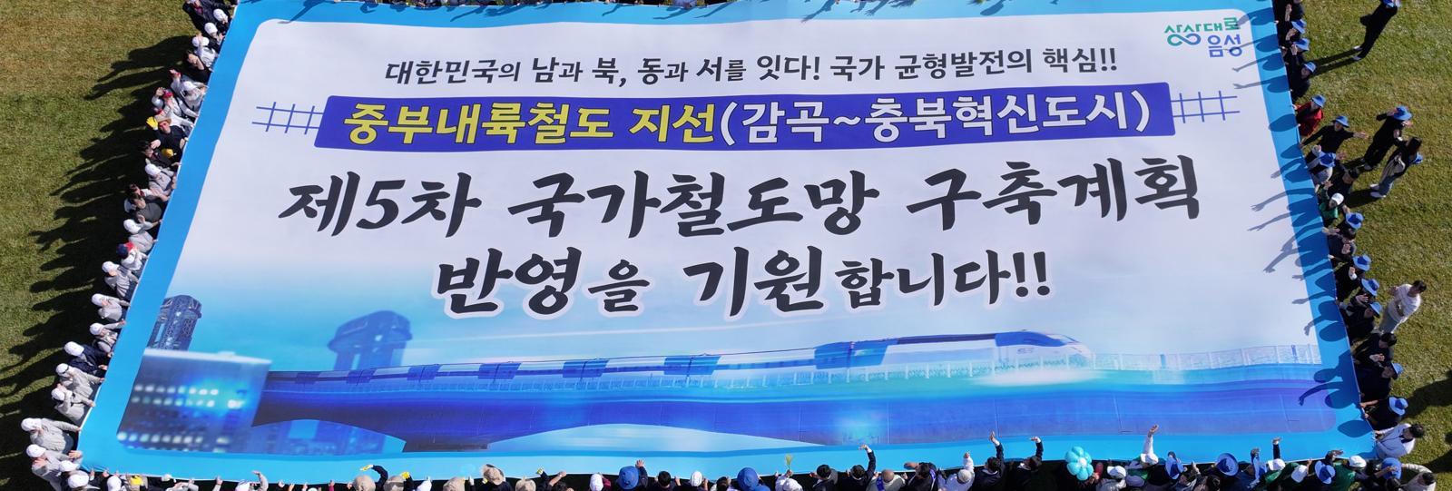 20일 군에 따르면 음성군철도대책위원회(위원장 여용주)는 전날 음성종합운동장에서 1000여 명이 모인 가운데 중부내륙철도 지선 건설 결의대회를 열었다. 이날 참석자들은 중부내륙철도 지선 국가철도망 반영을 바라는 글귀가 적힌 대형 현수막 퍼포먼스를 펼치며 지역경제와 미래성장의 핵심 동력이 될 중부내륙철도 지선 건설을 염원했다.