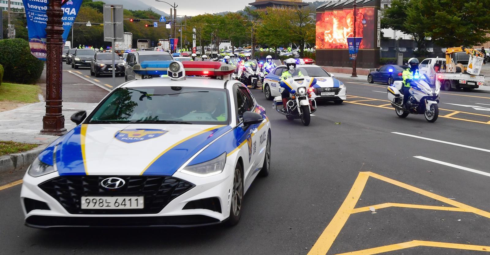 아시아태평양경제협력체(APEC) 정상회의를 열흘 앞둔 20일 경북 경주시 신평동 화백컨벤션센터 일대에서 경찰이 각국 정상들의 경호 이동 훈련을 하고 있다.