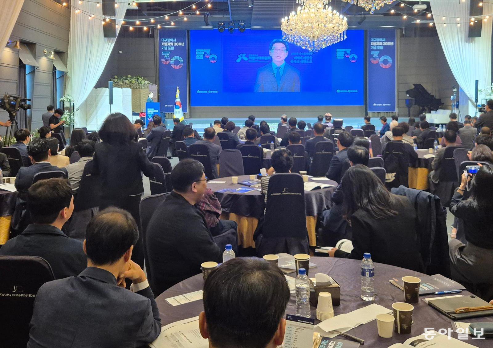 22일 대구시 북구 삼성창조캠퍼스 중앙컨벤션센터에서 열린 ‘지방자치 30주년 기념 포럼’에서 참석자들이 김경수 지방시대위원장의 영상 축사를 시청하고 있다. 이번 포럼에서는 지방 재정 자율성 강화와 지역 균형 발전 방안 등이 논의됐다. 대구=장영훈 기자 jang@donga.com