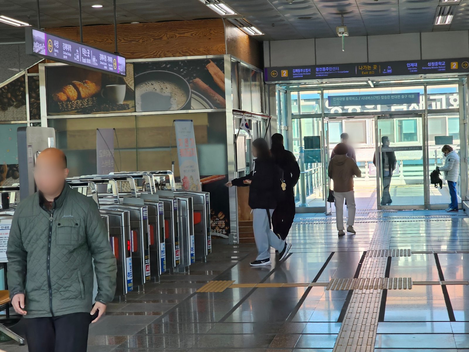 역 밖에선 인제대로 등교하는 학생들이 셔틀버스를 기다리며 승강장에서 발을 동동 구르고 있었다.