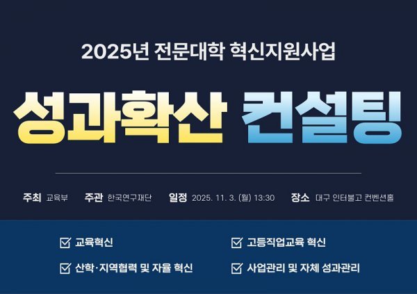 교육부(장관 최교진)와 한국연구재단(이사장 홍원화, 이하 연구재단)은 지난 3일부터 오는 7일까지 5일간 대구 인터불고 호텔에서 ‘2025년 전문대학 혁신지원사업 컨설팅’을 개최한다.