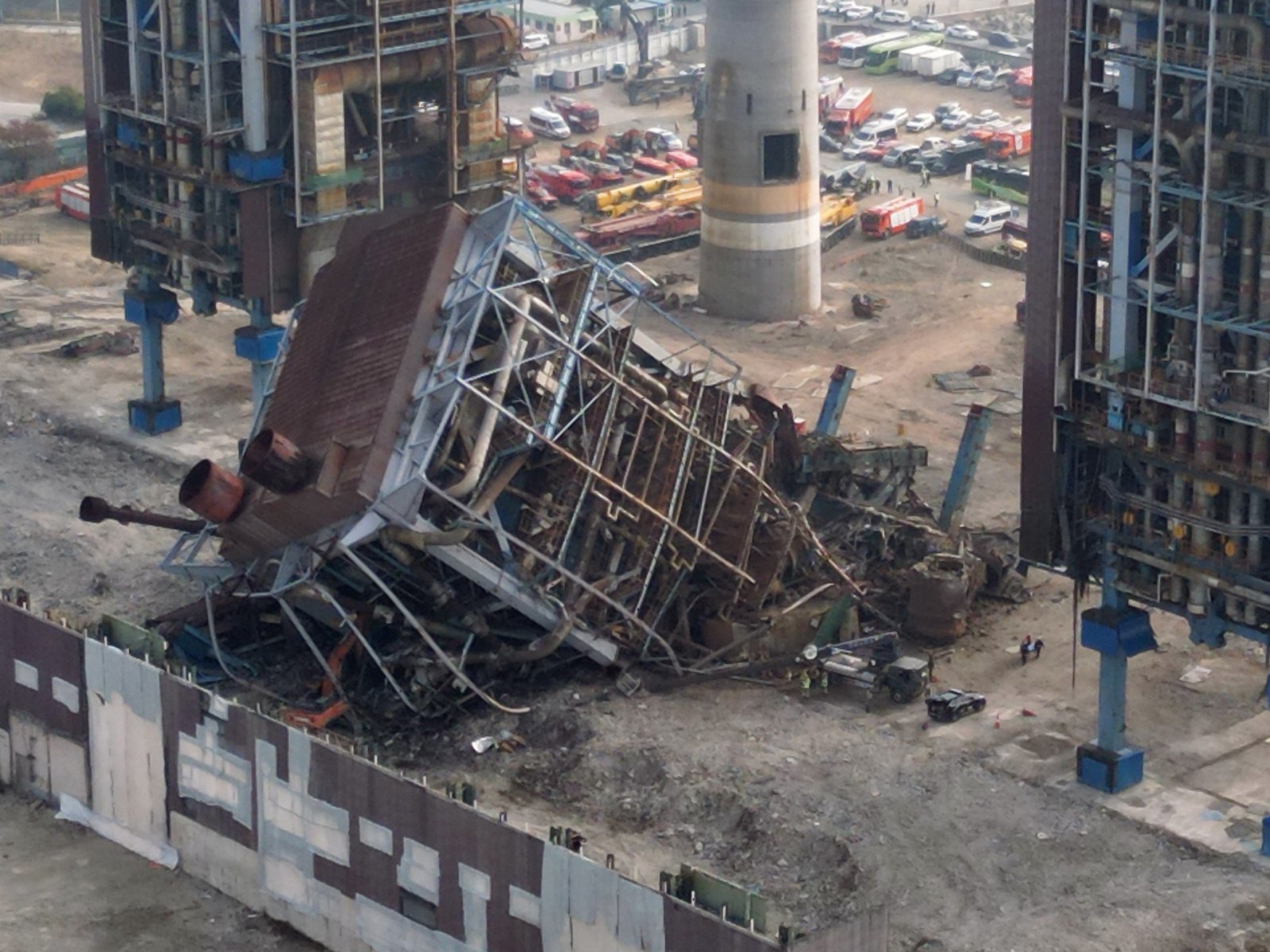 7일 울산 남구 동서발전 울산화력발전소 보일러 타워 붕괴현장에서 소방대원들이 매몰자 수색 및 구조작업을 벌이고 있다. 2025.11.7 뉴스1