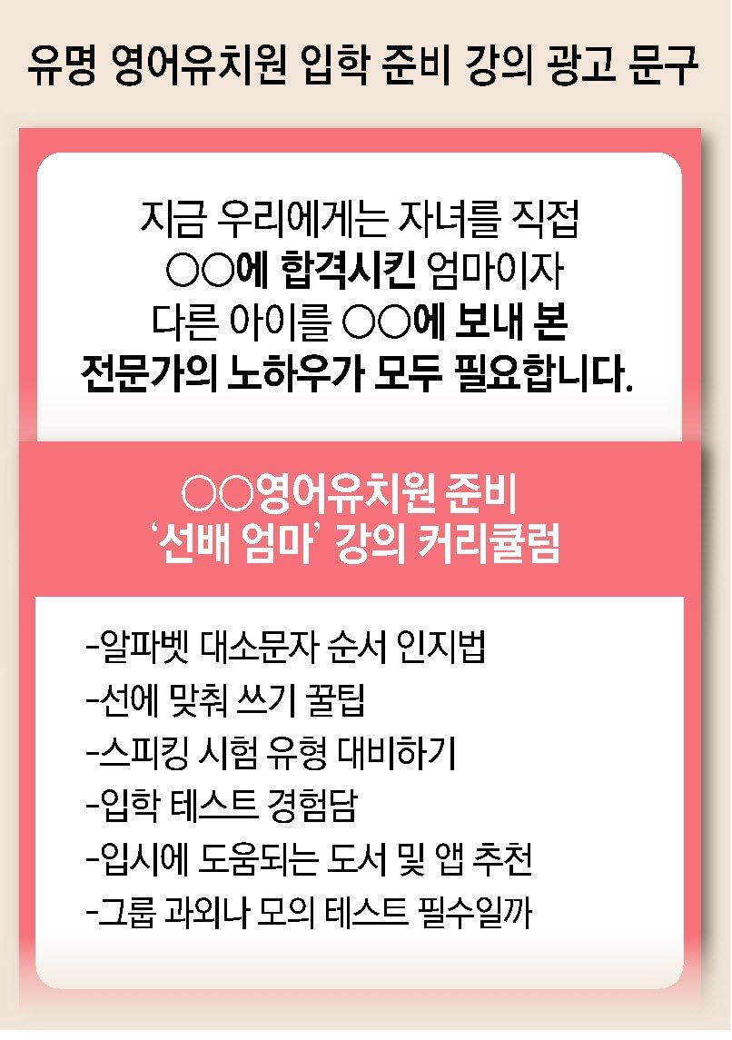 최근 한 인터넷 강의업체 사이트에 올라온 광고다. OO은 서울 강남구의 유아 대상 유명 영어 학원(일명 영어 유치원)으로, 4세 대상 ‘레벨 테스트’가 있어 입학이 어렵고 원비가 비싼 곳으로 꼽힌다. 해당 사이트는 자녀를 해당 영어 유치원에 보낸 경험이 있는 ‘선배 엄마’가 강의를 진행한다는 점을 내세웠다. 대상은 이 유치원 입학을 원하는 4세 이하 아이를 둔 학부모들이다. 수강료는 약 35만 원으로 합격 전략부터 입학 후 학습 계획까지 알려주는 총 42강 분량 동영상 강의로 구성돼 있다.