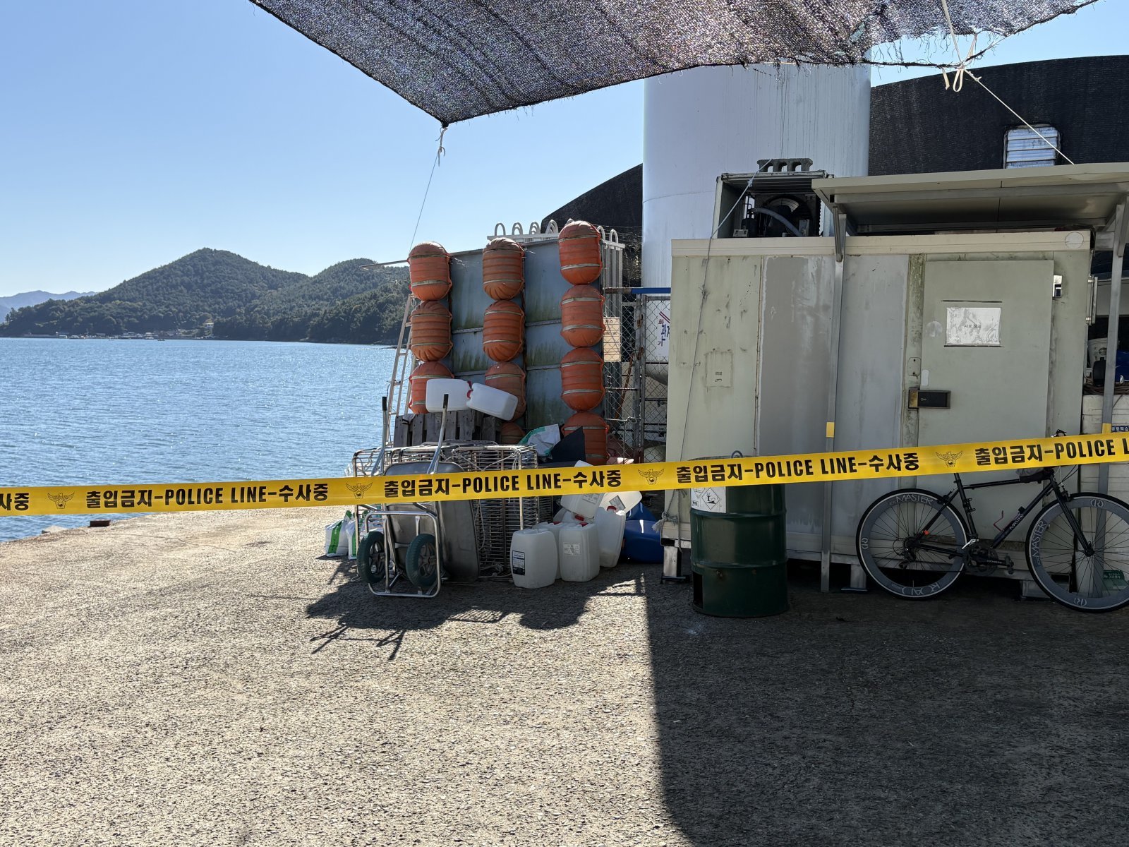 10일 작업자 3명이 사망한 경남 고성군의 한 양식장 앞에 폴리스라인이 설치돼 있다.2025.11.10/뉴스1