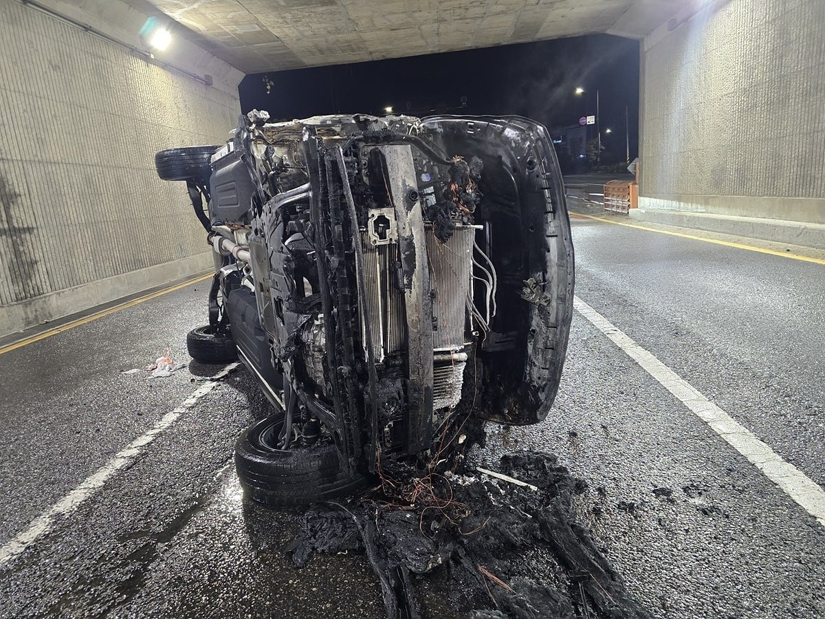 목격자 신고를 받고 출동한 경찰과 소방 당국이 현장에 도착했을 때 차량은 고덕지하차도 안에서 좌측으로 전도된 채 불에 타고 있었다.