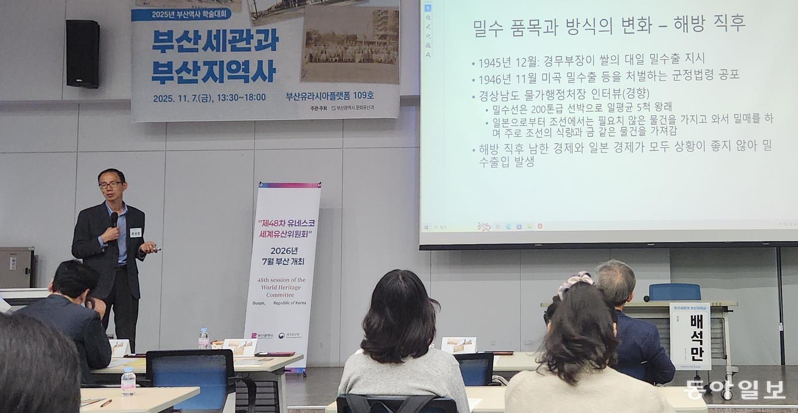 7일 부산 동구 부산유라시아플랫폼에서 열린 학술대회에서 류상윤 울산대 경제학과 교수가 ‘부산항과 밀수 변천사’를 주제로 연구 결과를 발표하고 있다. 김화영 기자 run@donga.com