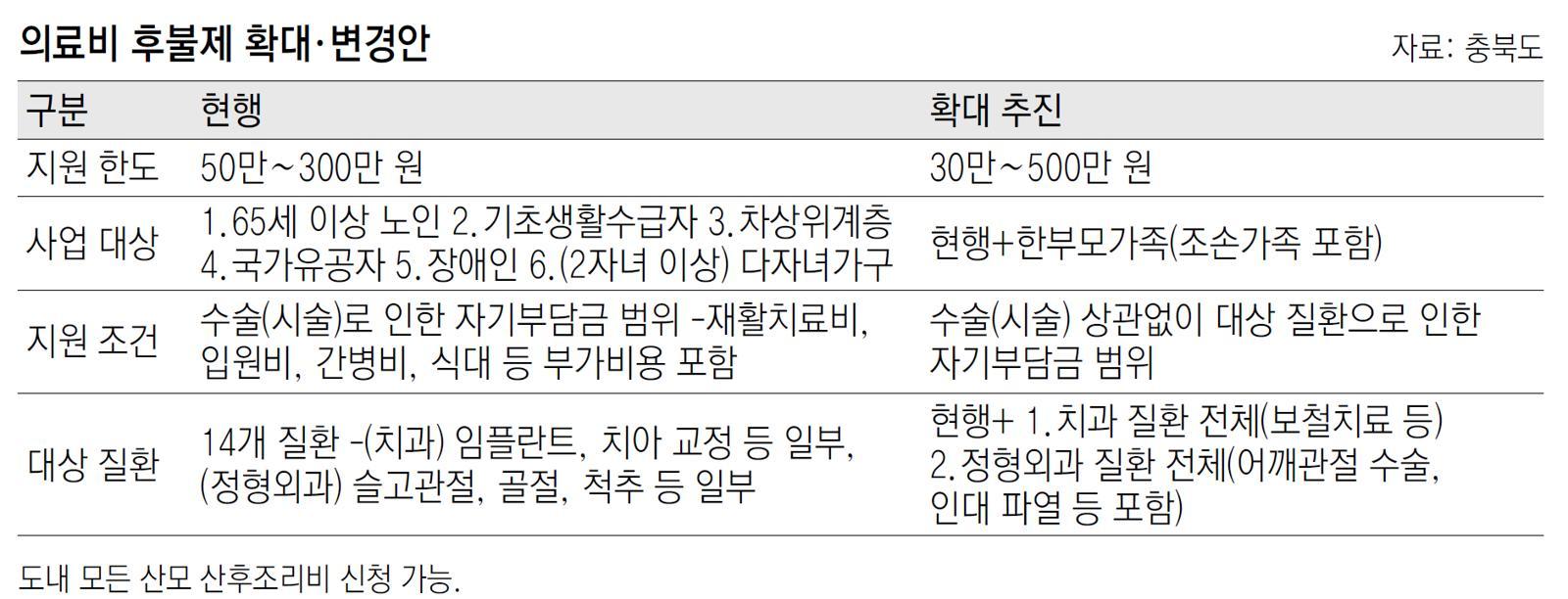 충북도의 신개념 의료복지 정책인 ‘의료비 후불제’ 융자 한도가 다음 달부터 500만 원으로 상향된다. 도는 300만 원이었던 무이자 융자 지원액 상한을 500만 원으로 올리고, 수혜 대상에 한부모 가족도 추가한다고 12일 밝혔다. 또 수술이나 시술을 하지 않아도 혜택을 받을 수 있도록 했다고 덧붙였다.