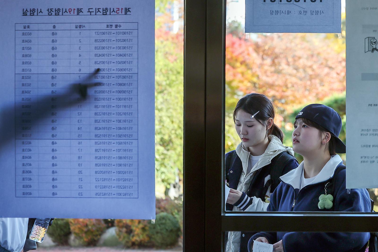 2026학년도 대학수학능력시험을 하루 앞두고 예비 소집이 실시된 12일 오후 서울 중구 이화여자고등학교에서 수험생들이 시험실 위치를 확인하고 있다. 2025.11.12 뉴스1