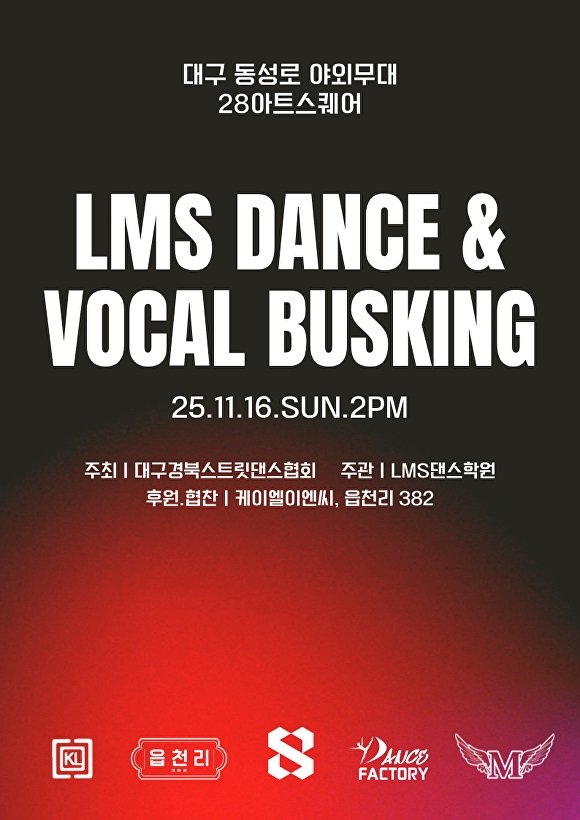 대구경북스트릿댄스협회는 16일 오후 2시 중구 동성로 28아트스퀘어에서 ‘LMS 댄스 버스킹 in 동성로’를 개최한다. 이번 행사는 침체한 동성로 상권을 활성화하고 시민들에게 문화 공연을 제공하기 위해 마련됐다.