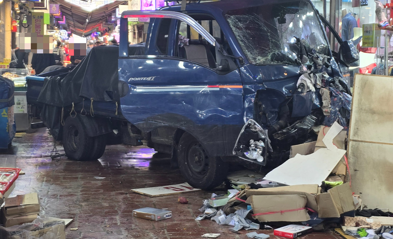 조승연 기자 cho@donga.com사고 직후 기자가 방문한 시장은 마치 포탄이 휩쓸고 지나간 듯 어수선했다. 시장 안은 부서진 매대와 파편이 뒤엉켜 사고 충격을 그대로 보여줬다. 사고 트럭의 전면부는 크게 찌그러졌고, 마지막으로 들이받은 의류 매장의 양말과 잠옷 등이 차량 헤드라이트 틈에 그대로 끼여 있었다. 트럭이 지나간 자리엔 깨진 유리와 부서진 매대, 파편들이 곳곳에 흩어져 있었다.