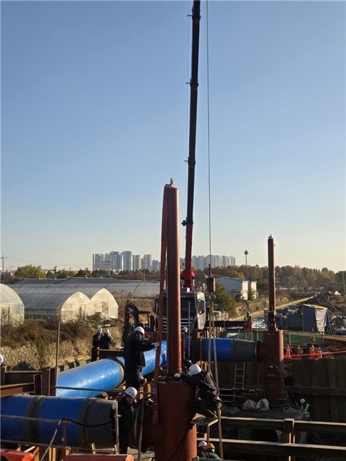 14일 경기 고양시 덕이동 광역상수도 송수관로 누수 지점에서 복구작업이 진행되고 있다. (한국수자원공사 제공)