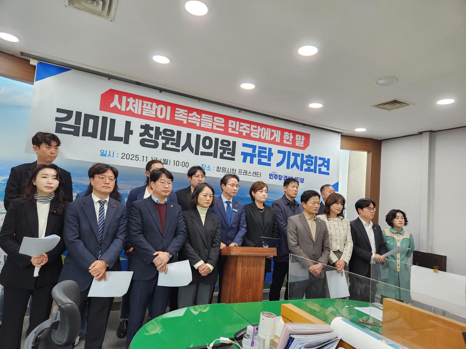 17일 창원시청에서 더불어민주당 경남도당 관계자들이 기자회견을 열어 김미나 창원시의원을 규탄하고 있다. 더불어민주당 경남도당 제공