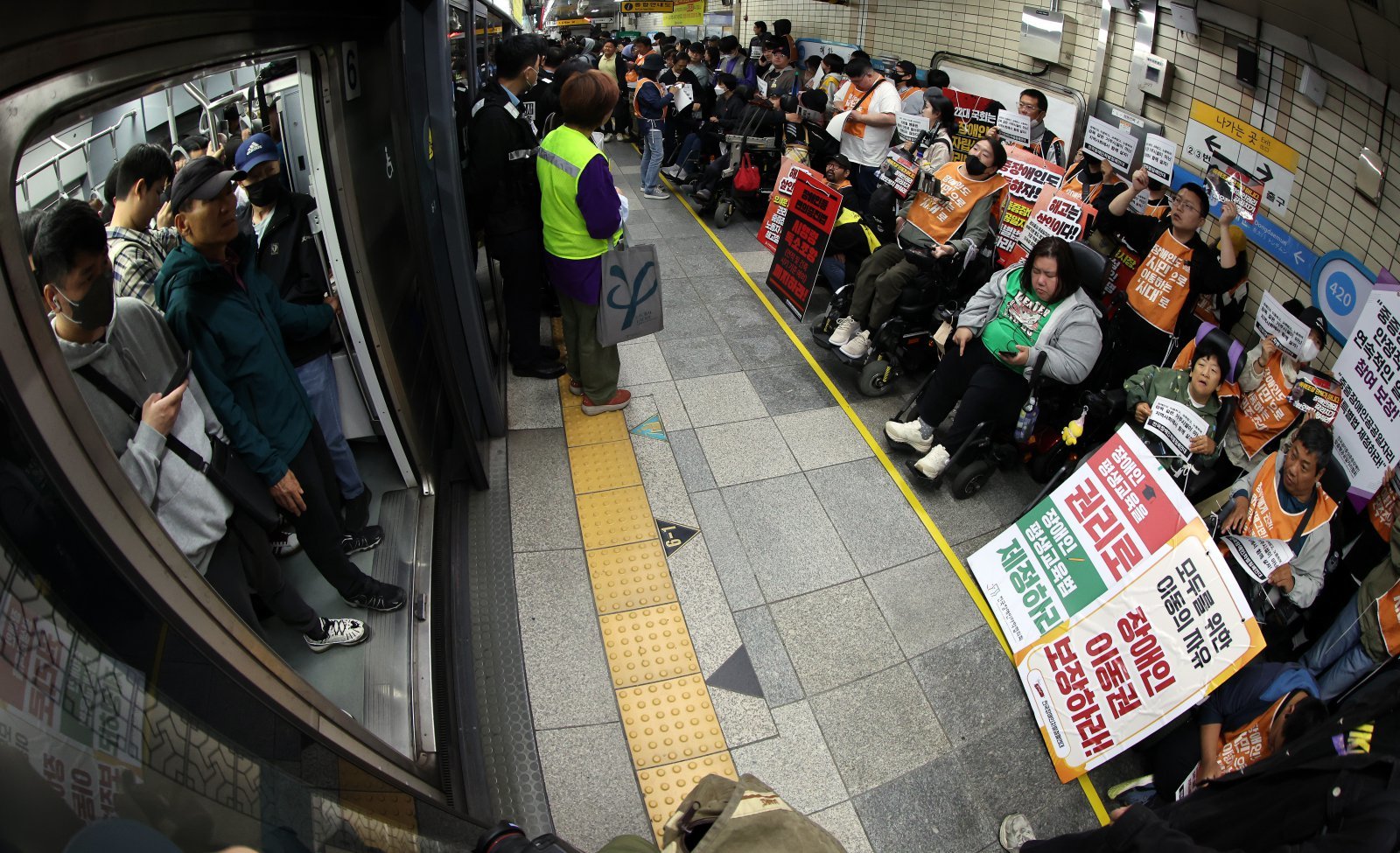 서울 지하철 4호선 혜화역 동대문 방면 승강장에서 열린 제62차 ‘출근길 지하철 탑니다’ 시위에서 전국장애인차별철폐연대(전장연) 회원들과 지하철 탑승 시민들이 마주보고 있다. 2025.4.21 뉴스1
