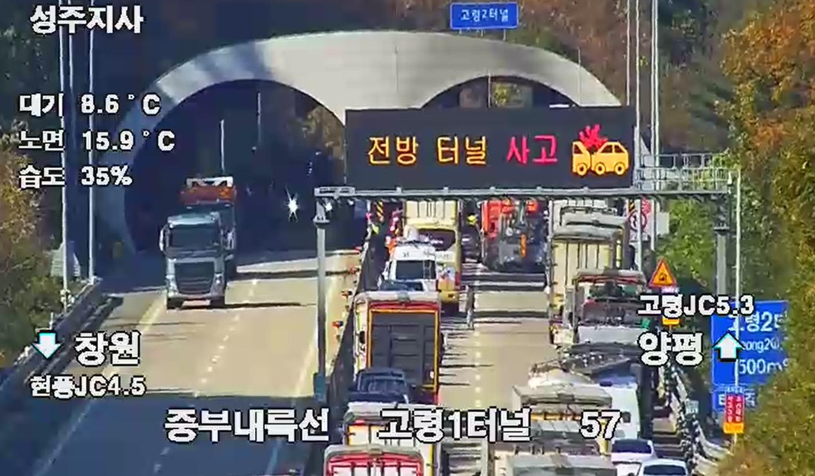 18일 오후 12시 34분경 중부내륙선 고령 2터널(양평방향 58.7㎞) 내 화물차 사고로 화재가 발생해 통행이 전면 차단됐다. 2025.11.18. 로드플러스 갈무리