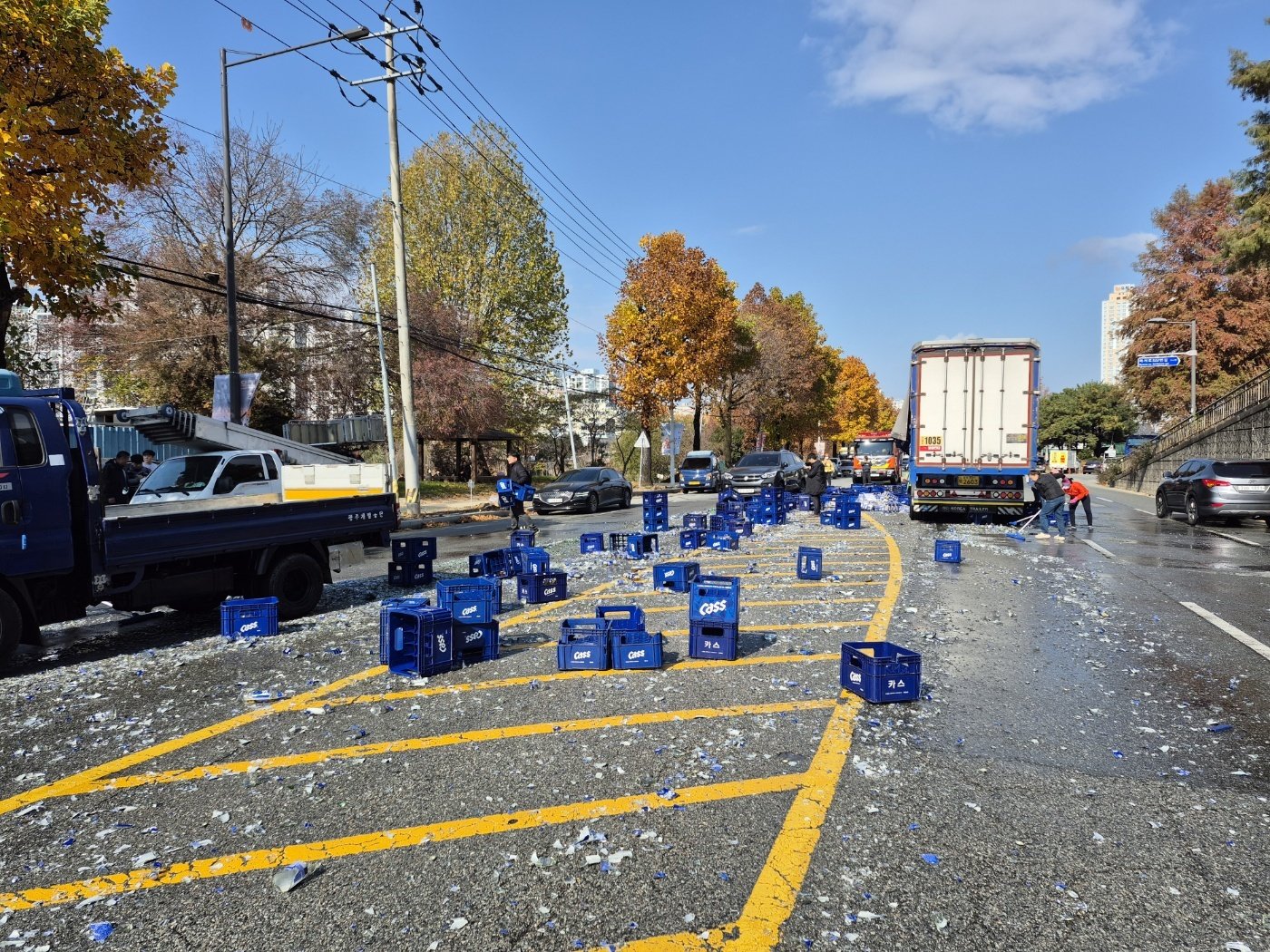 18일 낮 12시 13분쯤 광주 북구 양산동의 한 도로에서 맥주화물차에 적재된 맥주박스가 쏟아져 관계당국이 안전 조치에 나섰다. (광주 북부소방 제공)