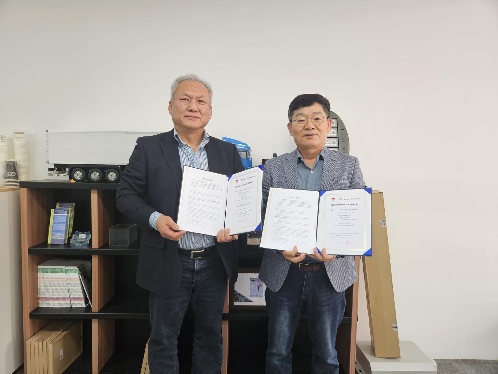 강의석 포인콤 연구개발총괄이사(오른쪽)와 오우더푸 관계자가 최근 슈퍼커패시터 기반 전기오토바이 공동 개발 협약을 체결한 뒤 기념촬영을 하고 있다. 포인콤 제공