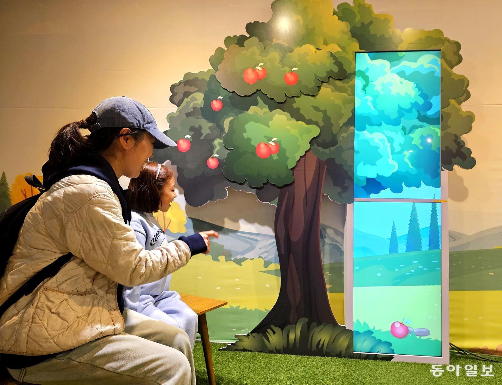 15일 인천 계양구 어린이과학관 ‘뉴턴의 비밀 노트’ 특별 전시회를 찾은 모녀가 떨어지는 사과를 관찰하며 만유인력의 법칙에 관해 배우고 있다. 뉴턴의 일대기를 배우면서 과학적 탐구 과정을 체험할 수 있는 이번 전시는 30일까지 열린다.