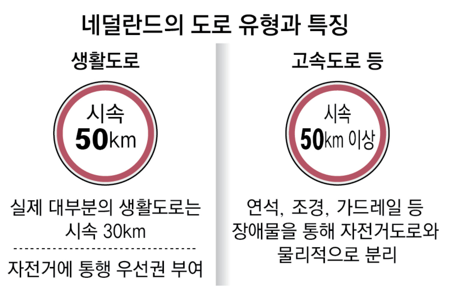 네덜란드는 도로 유형을 크게 생활도로와 집산도로, 통과도로(고속도로)로 나눈다. 주택이 밀집한 생활도로는 거의 예외 없이 시속 30km의 제한속도를 적용한다. 한국의 어린이보호구역과 유사하지만 지역 전체가 시속 30km로 묶인다는 점이 다르다. 일방통행로가 많은 것도 차량 흐름을 자연스럽게 제한하기 위한 설계다. 호리스 총괄은 “차가 멀리 우회하게 해 보행자와 자전거 이용자를 보호하는 것”이라고 설명했다. 최근에는 도심 전체를 시속 30km로 낮추는 절차도 진행 중이다.