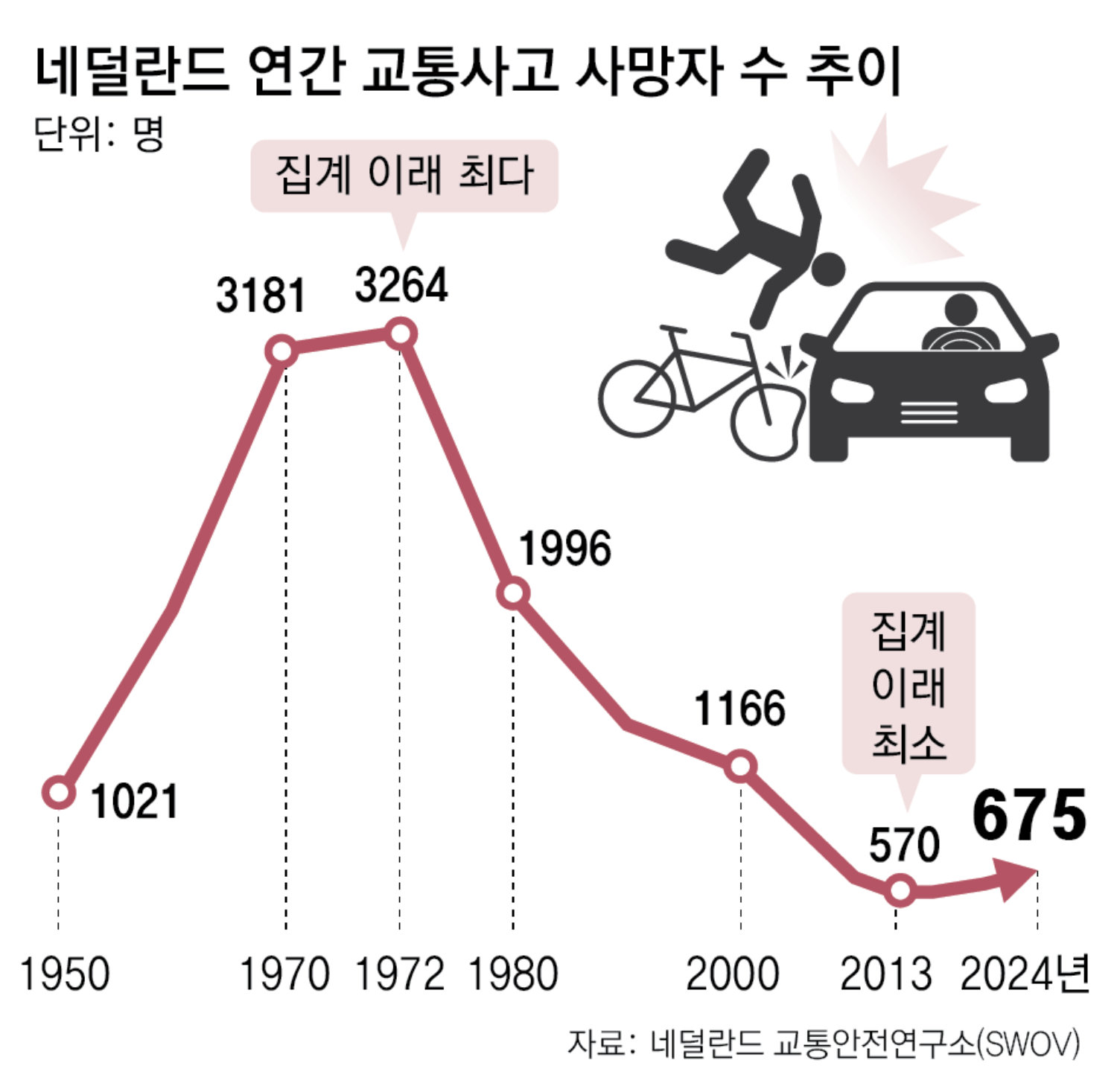 네덜란드는 1970년대부터 주택가 등 생활도로에서 자동차 속도를 낮추고 자전거 이용을 확대하는 정책을 일관되게 펴 왔다. 그 결과, 네덜란드 교통안전연구소(SWOV)에 따르면 1972년 3264명이었던 사망자 수는 지난해 675명으로 줄었다. 50여 년 만에 5분의 1 수준으로 줄어든 것이다.