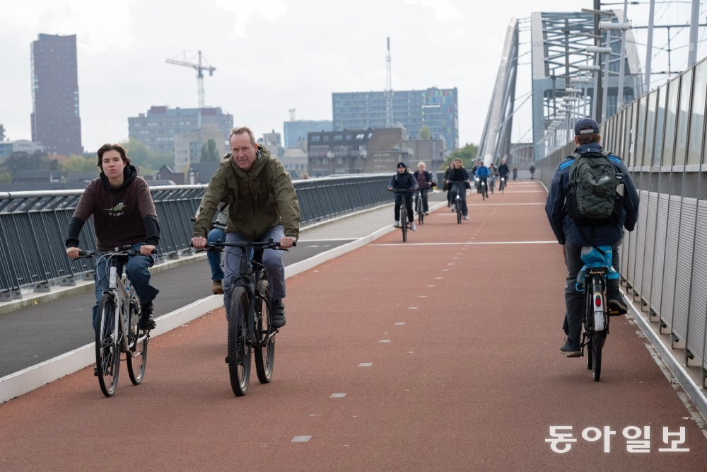 지난달 시민들이 네이메헌시의 자전거 전용 고속도로 ‘레인발파트’를 이용하고 있다. 이 도로를 이용하면 교통신호에 멈춰서지 않고 총 15.8㎞를 달려 인근 도시인 아른험까지 이동할 수 있다. 네이메헌=박종민 기자 blick@donga.com