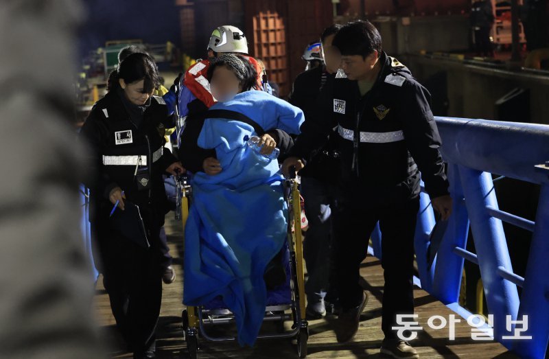 휠체어에 실려 구조되는 승객 제주에서 목포로 향하던 여객선 퀸제누비아 2호가 전남 신안군 장산면 족도 남쪽 해역에서 좌초한 19일 오후 구명조끼를 입은 승객이 해양경찰에 의해 구조돼 전남 목포해양경찰서 전용 부두로 옮겨지고 있다. 목포=박영철 기자 skyblue@donga.com