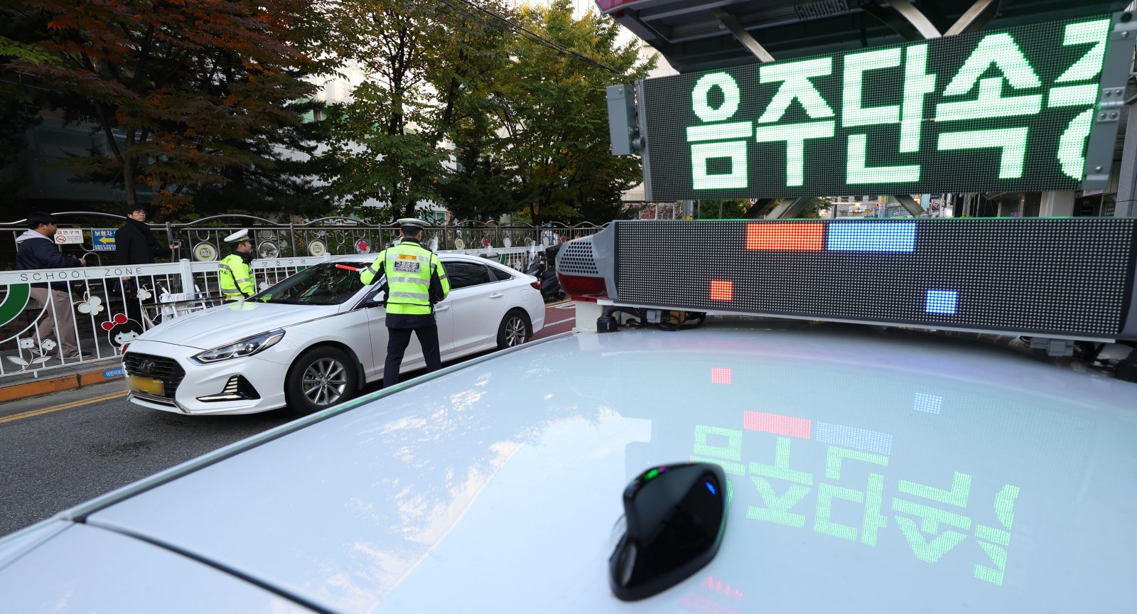 4일 서울 강남구 논현초등학교 인근에서 열린 서울교통 Re-디자인 프로젝트 관련 ‘속 시원한 교통 단속’ 동행 취재에서 경찰들이 어린이보호구역 주변 음주운전 및 정지선 위반 등을 단속하고 있다. 2025.11.04. [서울=뉴시스]