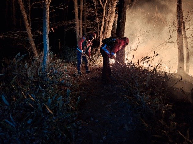 산림·소방 당국은 밤샘 진화 작업 끝에 이날 오전 7시 기준 진화율을 55%까지 끌어올렸다. 이에 앞서 산림청은 오전 4시를 기해 ‘산불확산 대응 1단계’를 발령했다. 밤샘 진화에 투입된 투입 인원은 326명, 장비는 101대다.