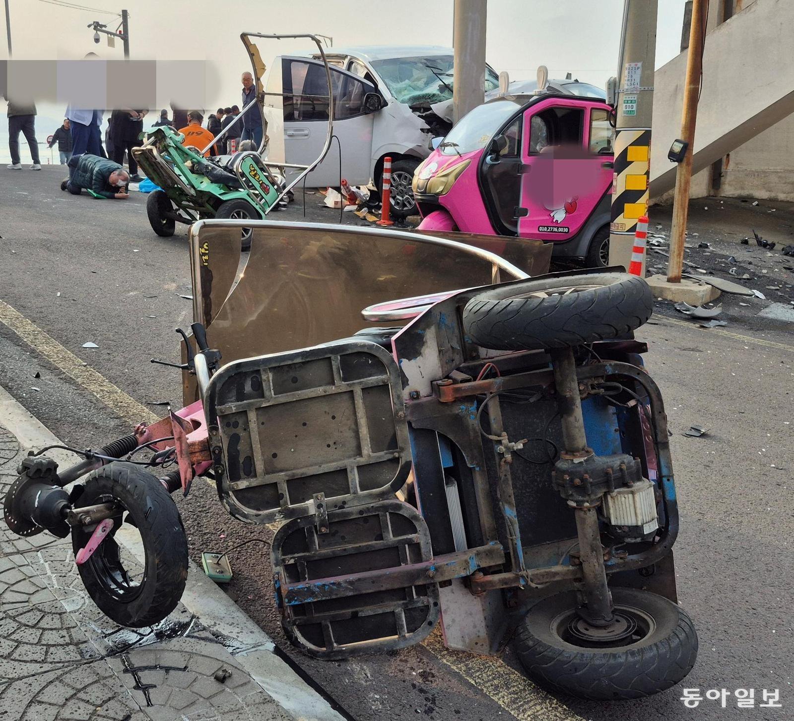 24일 제주 제주시 우도면 연평리 천진항 인근에서 62세 남성이 몰던 스타렉스 승합차(사진 맨 위 차량)가 항구 대합실 방향으로 돌진해 삼륜차(아래) 등과 충돌한 뒤 전신주를 들이받고 멈춰 서 있다. 이 사고로 3명이 숨지고 10명이 다쳤다. 경찰과 소방당국은 정확한 사고 경위를 조사하고 있다. 우도 주민 제공