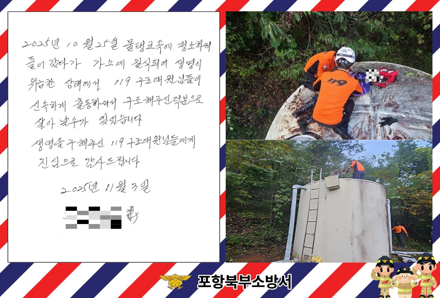 경북 포항에서 질식 사고를 당한 70대 남성이 자신의 생명을 구해준 소방대원들에게 감사 편지를 전해 화재다.