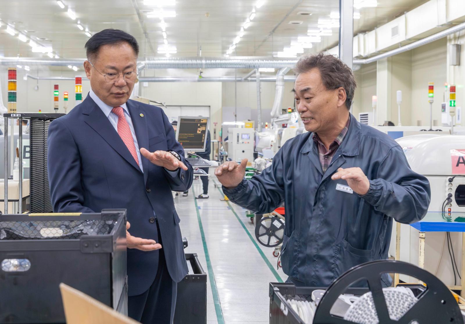 김재욱 칠곡군수(왼쪽)가 최근 경북 칠곡군의 한 기업체를 찾아 업체 관계자로부터 애로 사항 등을 듣고 있다. 칠곡군 제공