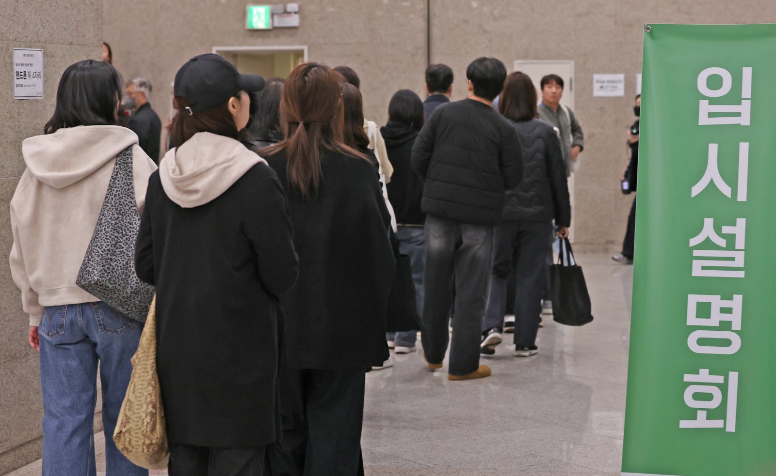 14일 오후 서울 광진구 세종대에서 열린 종로학원 2026학년도 수능점수 분석 및 정시 합격점수예측 긴급설명회를 찾은 학부모들이 줄을 서고 있다. 뉴스1