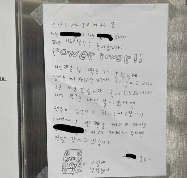 그러면서 “혹시 GS25에서 지디 맥주를 사신 분이 있다면 맥주는 안주셔도 되니(저 10살…) 다 먹으시고 빈 캔을 버리지 마시고 주시면 정말 감사하겠습니다”라고 쓰고 지드래곤 맥주 그림도 그려 넣었다.
