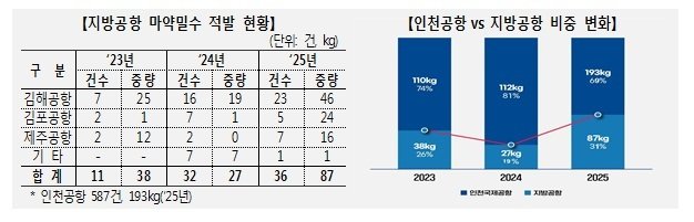 여행자·특송·국제우편의 이동이 가장 많은 인천공항을 중심으로 첨단 검색장비 및 위험관리 고도화 등 마약단속 역량이 강화되자 이를 회피하기 위해 지방공항으로 우회해 밀반입을 시도하는 것으로 분석된다.