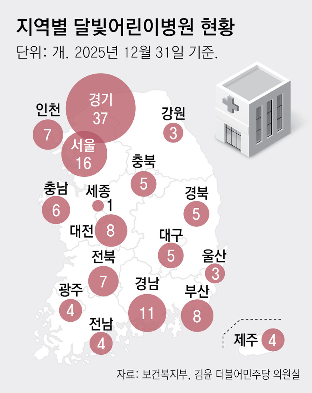 하지만 지역별로 병원 수가 크게 차이 나 일부 지방에서는 부모들이 한밤중에 수십 km 떨어진 달빛어린이병원을 찾아 헤매는 사례가 적지 않다. 지난해 12월 말 기준 달빛어린이병원 총 134곳 가운데 서울(16곳), 경기(37곳), 인천(7곳)에 45%가 몰려 있다.