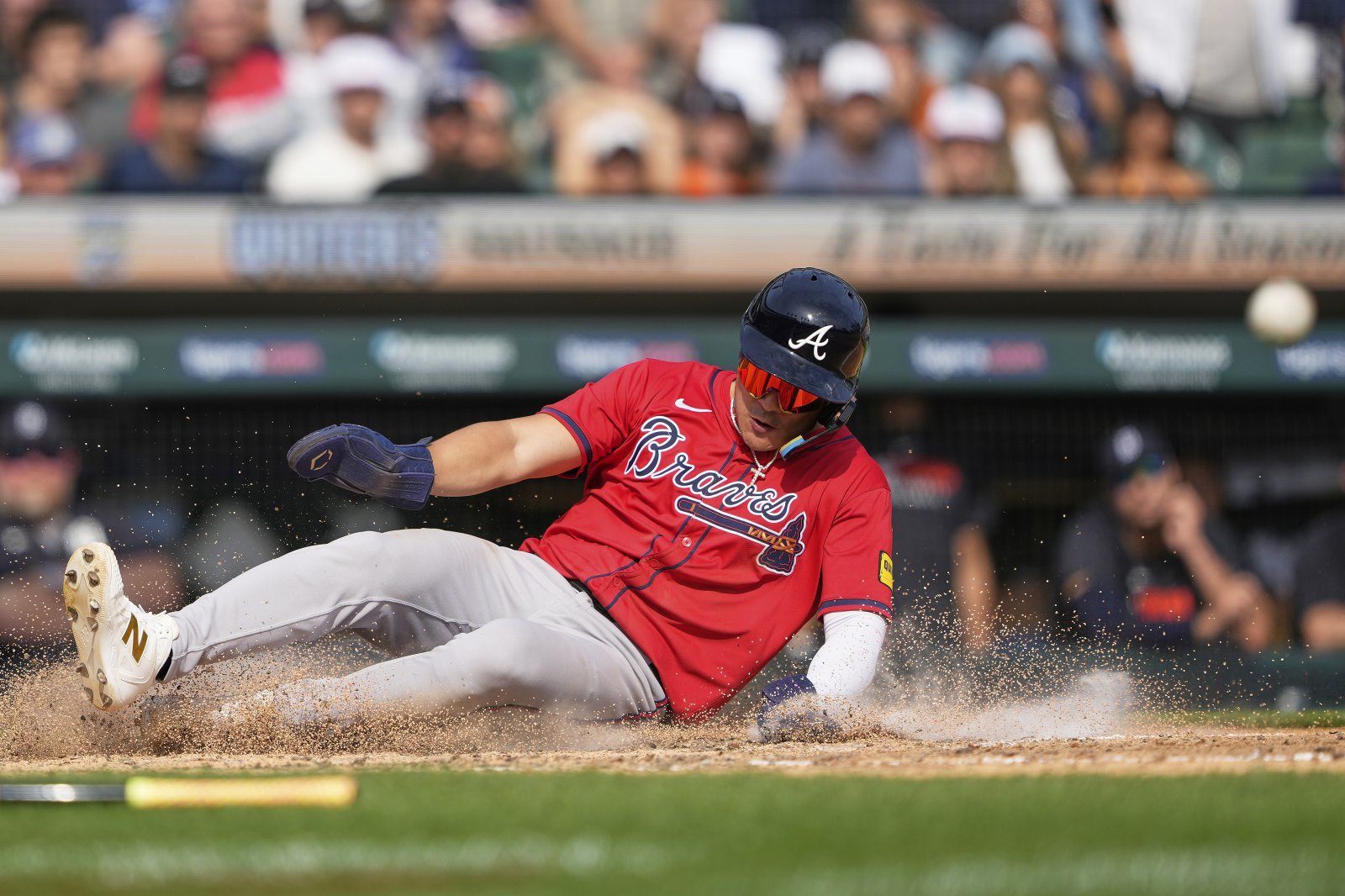 애틀랜타 브레이브스의 김하성이 21일(한국 시간) 미국 미시건주 디트로이트의 코메리카 파크에서 벌어진 2025 메이저리그(MLB) 디트로이트 타이거스와의 원정 경기에서 9회초 주릭슨 프로파의 안타 때 홈으로 파고들고 있다. 2025.09.21 디트로이트=AP 뉴시스