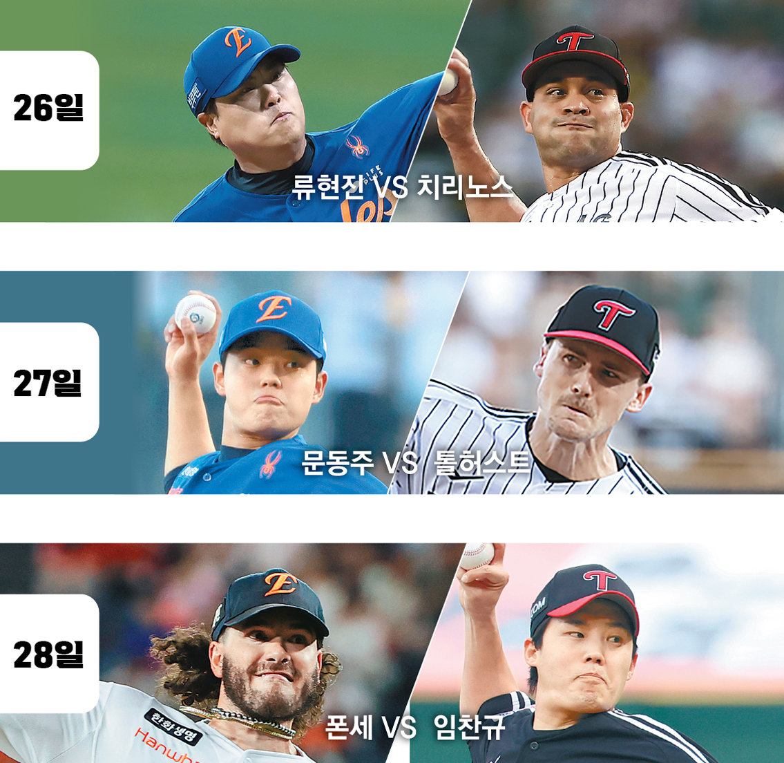 도전자 한화는 ‘미리 보는 한국시리즈’ 1차전 선발 투수로 ‘LG 킬러’ 류현진(38)을 내세운다. 류현진은 2006년 프로 데뷔 이후 LG를 상대로 통산 24승 9패 평균자책점 2.24를 기록 중이다. 올해는 1승 무패 0.95로 더 강했다. 이어 문동주(22)가 27일, 폰세(31)가 28일에 차례로 선발 마운드에 오를 예정이다.