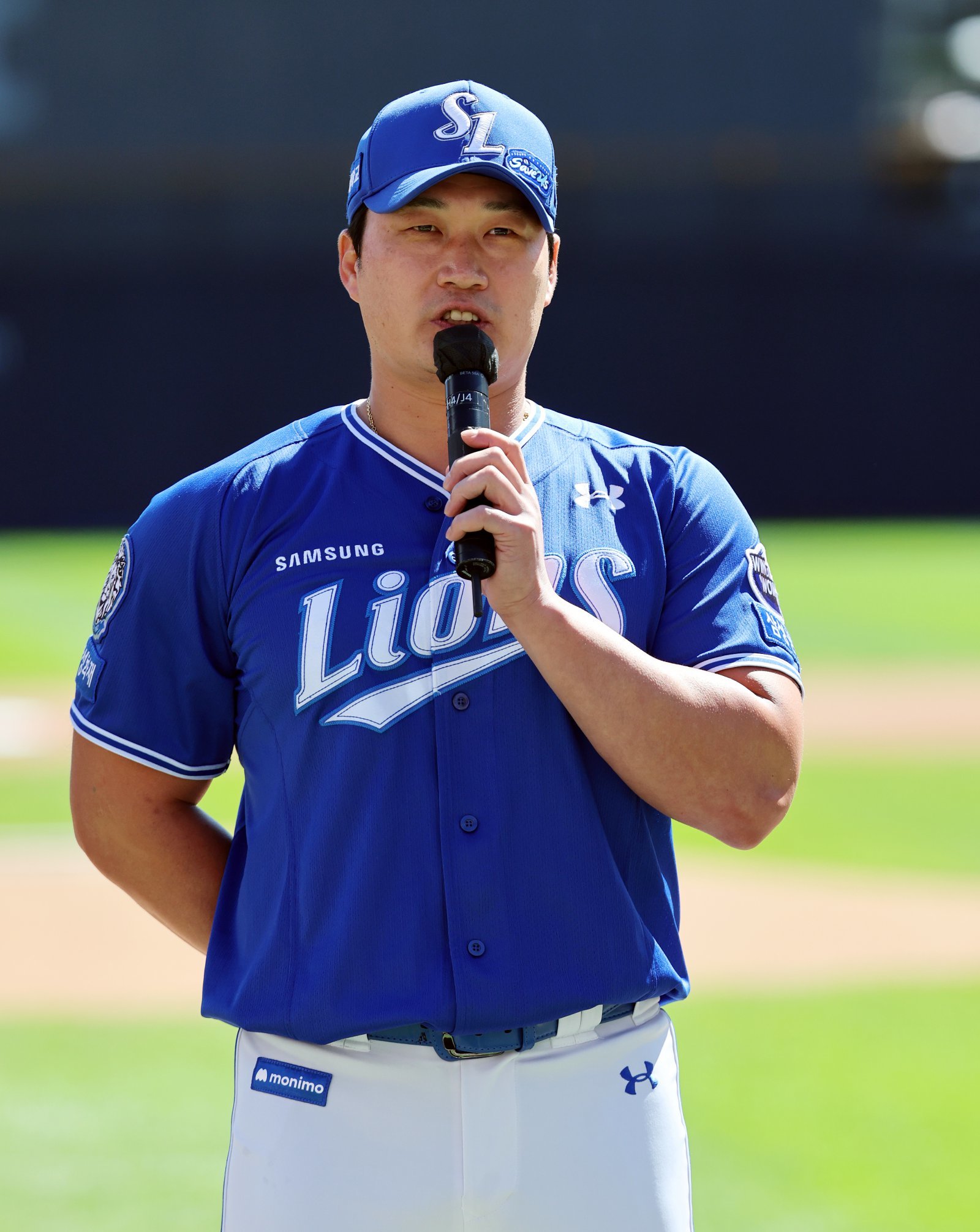 은퇴 투어 중인 삼성 라이온즈 오승환이 21일 오후 경기 수원시 장안구 KT위즈파크에서 열린 KT 위즈와의 원정 경기에 앞서 감사 인사를 전하고 있다. 2025.9.21/뉴스1