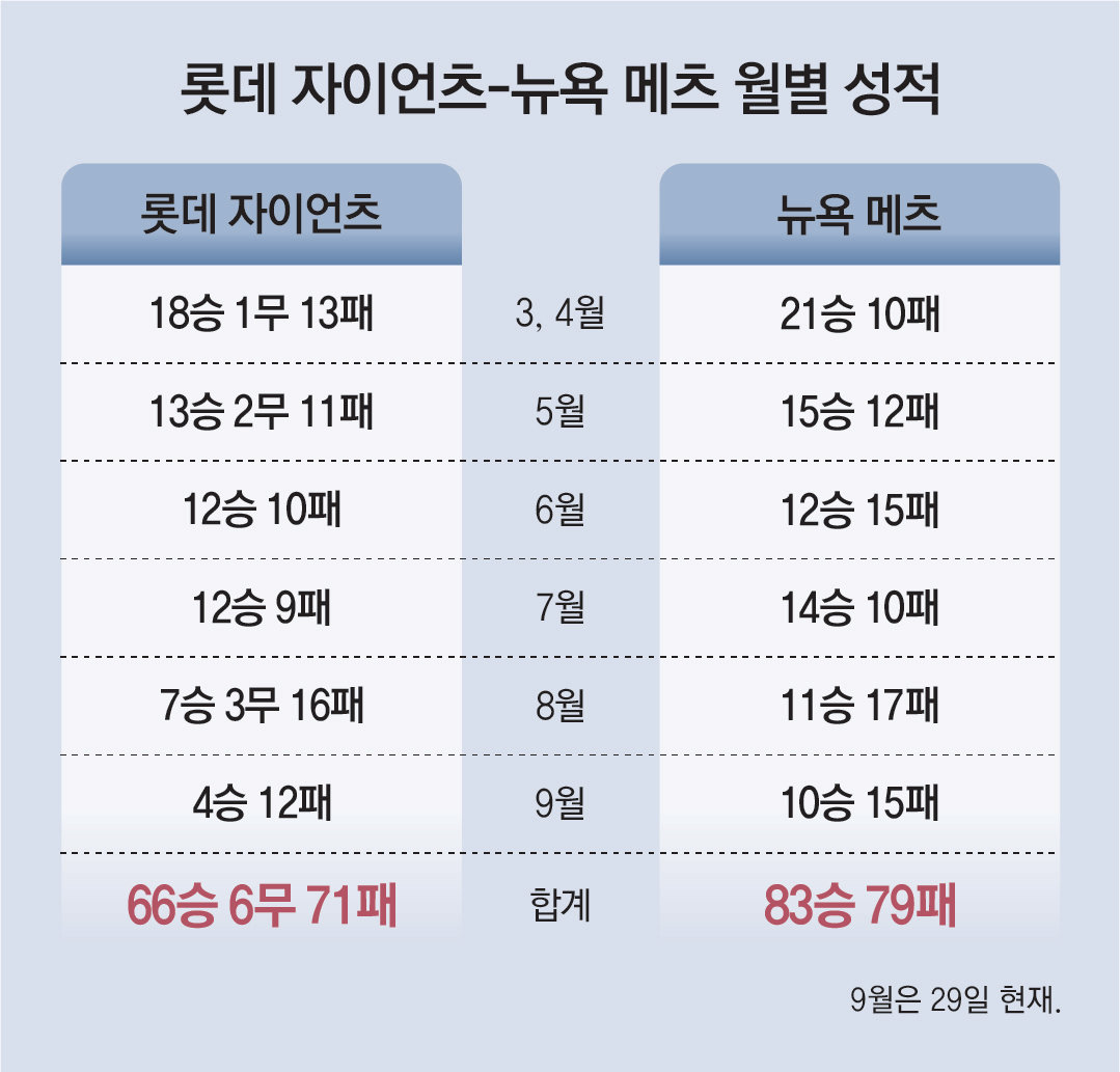 하지만 결과적으로 두 팀 모두 가을 야구 무대에 초대받지 못했다. 지난달 12연패를 당한 롯데는 8, 9월에 11승 3무 28패(승률 0.282)로 무너졌다. 메츠도 같은 기간 21승 32패(승률 0.396)에 그쳤다.