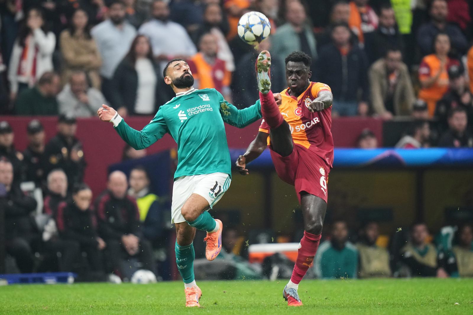 지난 시즌 잉글랜드 프리미어리그(EPL) 우승팀 리버풀의 공격수 무함마드 살라흐(왼쪽)가 1일 튀르키예 이스탄불에서 열린 갈라타사라이(튀르키예)와의 2025∼2026시즌 유럽축구연맹(UEFA) 챔피언스리그(UCL) 리그 페이즈 2차전 방문경기에서 상대 수비수 다빈손 산체스와 공을 다투고 있다. 리버풀은 이날 갈라타사라이에 0-1로 덜미를 잡혔다.