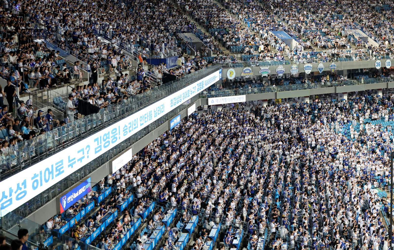 한국프로야구가 단일 시즌 최다 관중 신기록을 작성했다. 대구에는 2만4000명 만원 관중이 들어차며 삼성은 시즌 47번째 홈 경기 매진을 기록했다. 인천에는 2만1529명이, 창원에는 6590명의 관객이 찾았다. 이에 이날 경기 전까지 1084만9054명을 기록했던 올 시즌 총관객 수는 지난해 1088만7705명을 뛰어 넘는 1090만1173명을 달성했다. 사진은 이날 대구 수성구 삼성라이온즈파크에서 열린 KBO 리그 키움 히어로즈와 삼성 라이온즈의 경기에서 관중들이 열띤 응원을 하고 있다. 2025.09.05 뉴시스